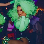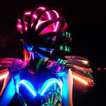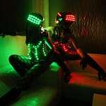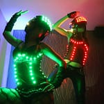 Unsere Performer:innen tragen speziell angefertigte LED-Kostüme in schrillen Farben kombiniert mit: